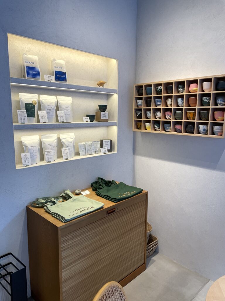 コーヒー豆のほかにMK Studioのカップとお店のトートバッグが売られていました。